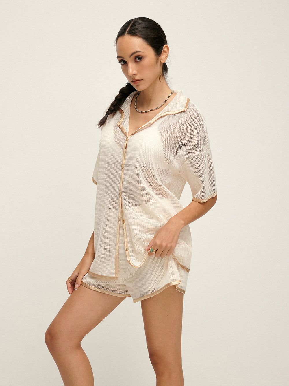 Düğmeli file oversize şortlu takım – bej, hafif ve nefes alabilen yapısıyla yaz aylarında rahatlık sağlar. İnce file kumaşı ve gevşek kesimi sayesinde konforlu bir kullanım sunar. Satin detaylı kenarları ise takıma şık ve modern bir dokunuş kazandırır. Evde ya da sahil kenarında kullanıma uygun olan bu takım, özgür ve ferah bir stil yakalamak isteyenler için idealdir. Hemen şimdi sipariş verin!