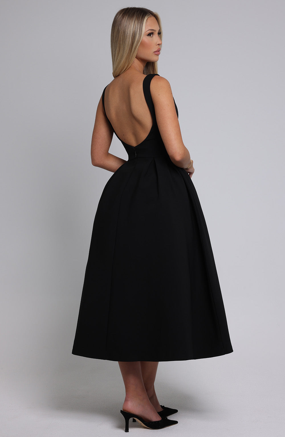 Sırtı Açık Kloş Kesim Midi Elbise – Siyah