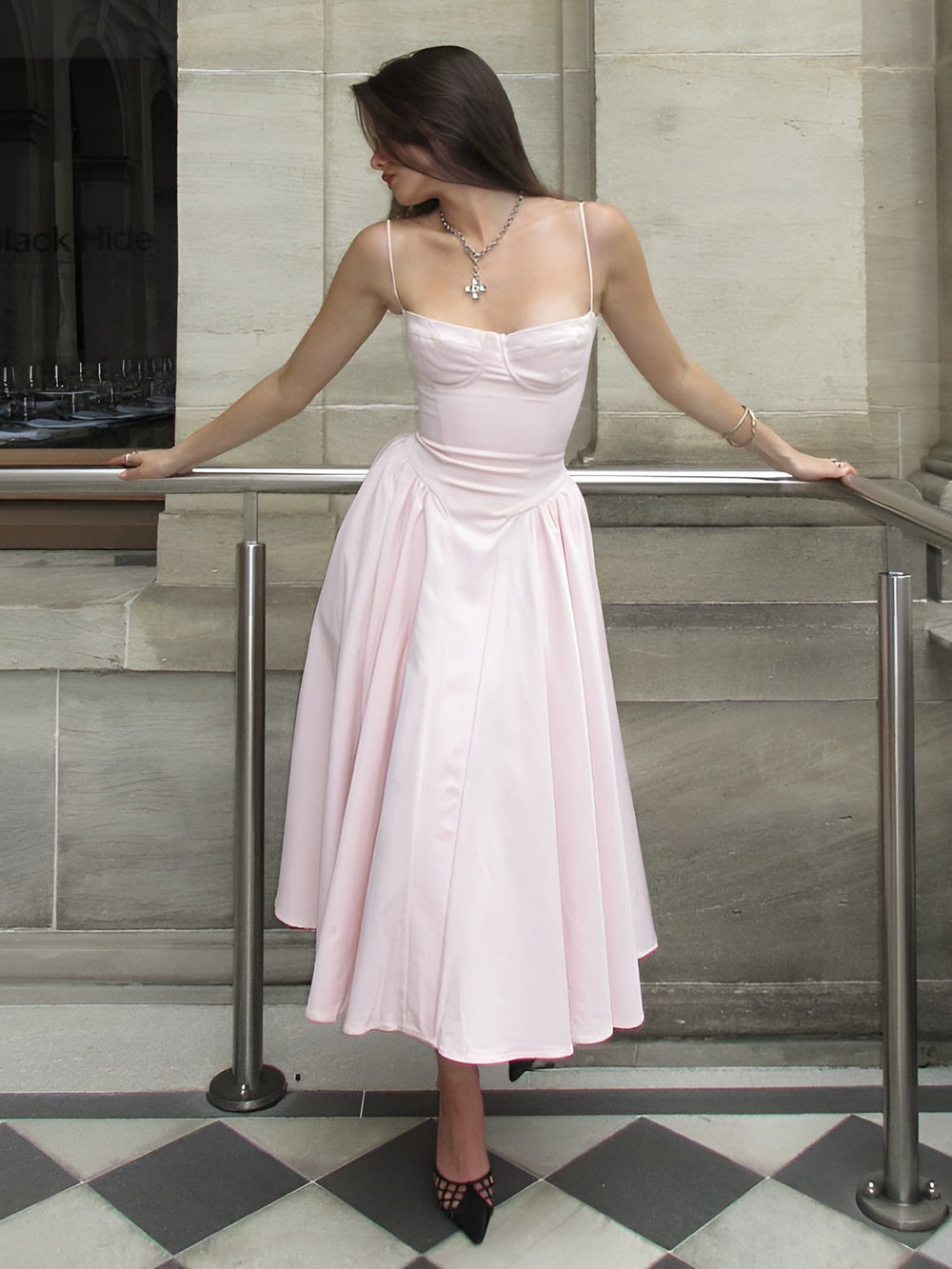Askılı Kabartma Detaylı Midi Elbise – Pudra
