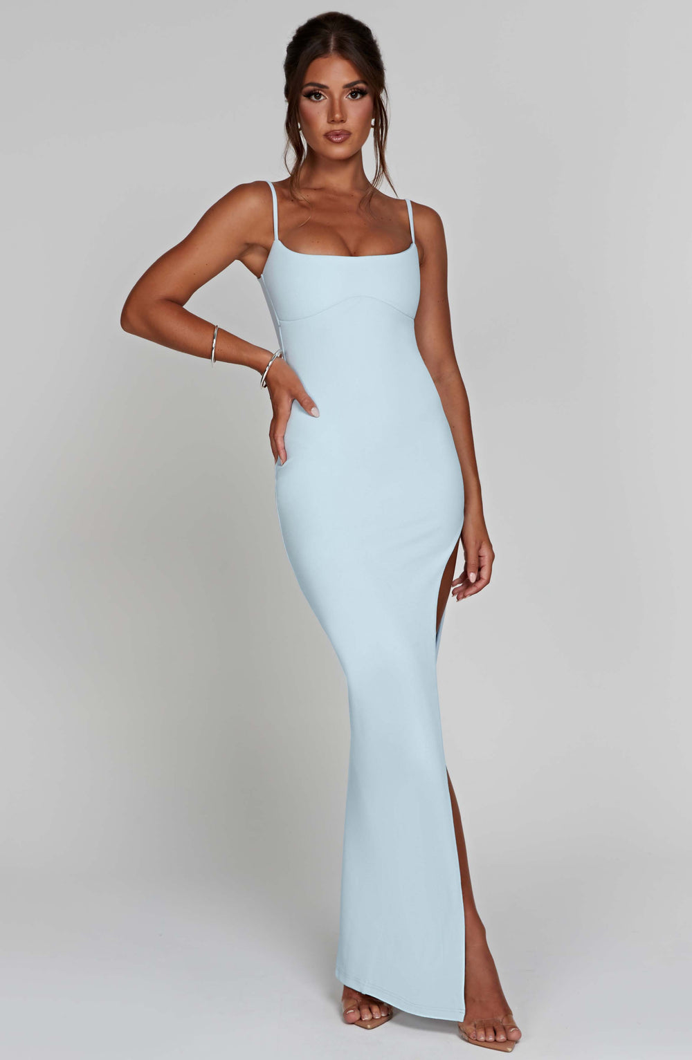 Yırtmaç Detaylı İnce Askılı Uzun Elbise – Bebe Mavisi