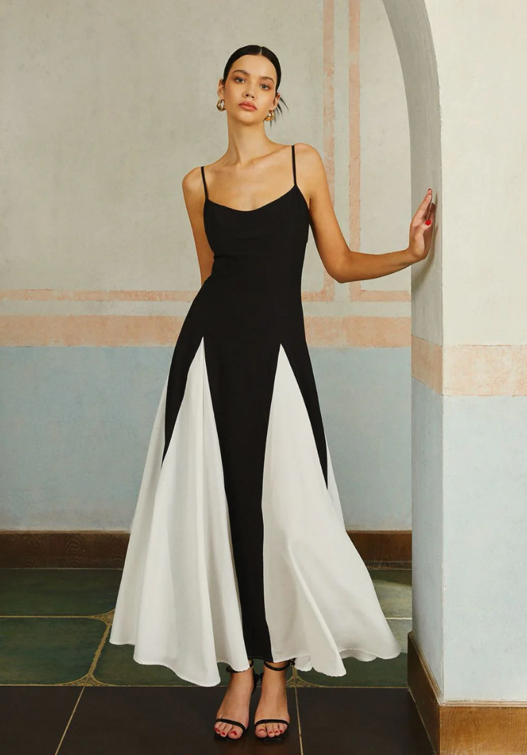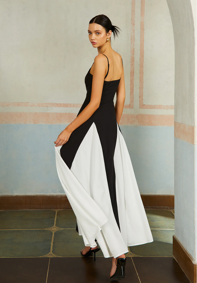 İnce Askılı Kontrast Renkli Uzun Elbise – Siyah Beyaz