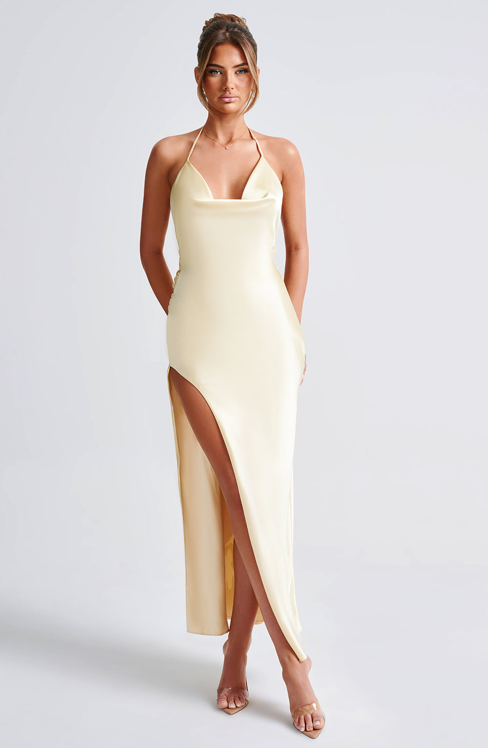 Saten Sırt Dekolteli Yırtmaçlı Uzun Elbise – Krem