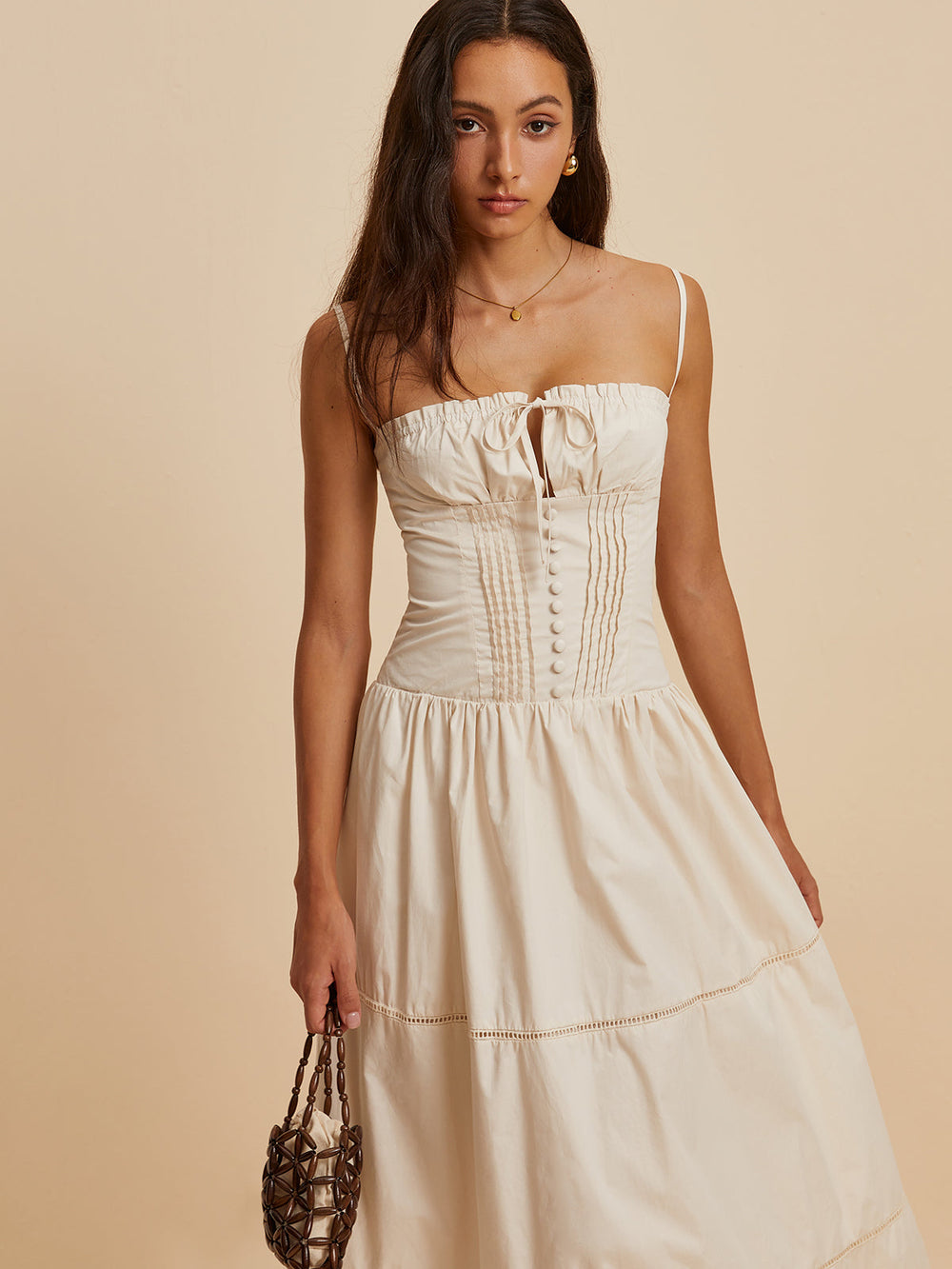 Askılı Büzgü Detaylı Uzun Pamuk Elbise – Ekru
