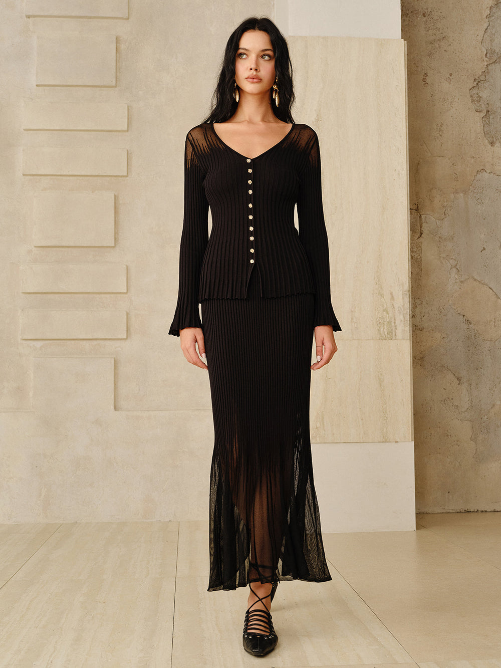 V Yaka Düğmeli Fitilli Triko Hırka – Siyah