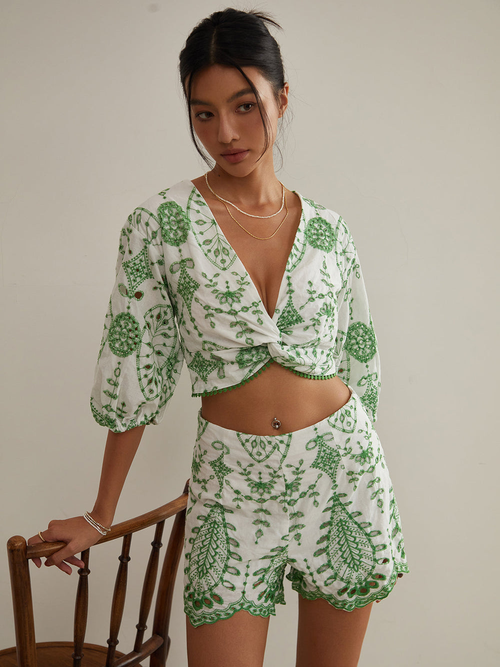 Nakış İşlemeli V Yaka Kısa Takım – Beyaz & Yeşil