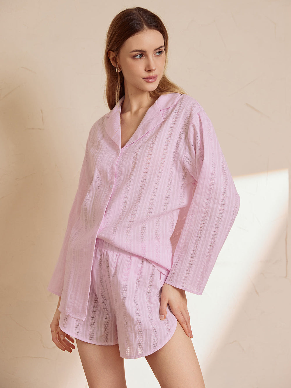 Düğmeli örme dokulu rahat şortlu takım – lila, hafif ve nefes alabilen kumaşıyla yaz aylarında konfor ve şıklığı bir arada sunar. Geniş yakalı, uzun kollu üstü ve bol kesimli şortu ile ev rahatlığını dış mekana taşır, sevimli ve sade görünümüyle hem evde hem dışarıda kullanıma uygundur. İnce çizgili transparan dokusu sayesinde ferah bir his sağlar ve gün boyu serin kalmanızı destekler. Şıklık ve rahatlığı aynı anda isteyenler için ideal bir tercih olan bu takım, gardırobunuzun vazgeçilmezi olacak. Şimdi sipariş verin!