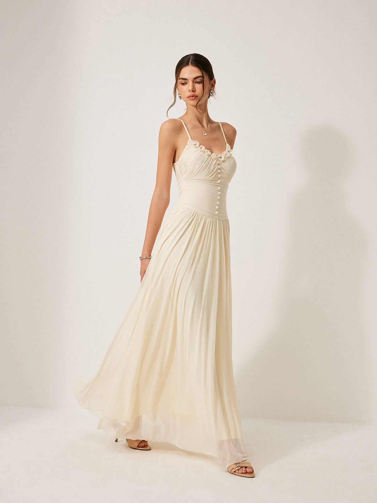 Askılı Çiçek Detaylı Beli Büzgülü Uzun Elbise – Ekru